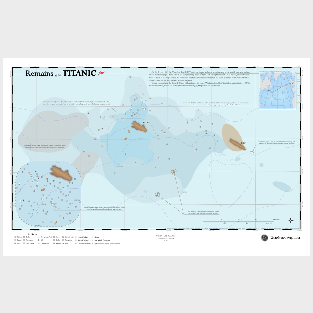 Discover the awe-inspiring history of the Titanic, which lay hidden for 74 years until its remarkable discovery in 1985. Even after more than a century, the tragic tale of the Titanic continues to enthrall audiences worldwide. Immerse yourself in the mystique of this iconic shipwreck, located approximately 3,500 meters beneath the ocean’s surface, under the immense pressure of 6,000 pounds per square inch. Enhance your Titanic collection with this captivating wall map.